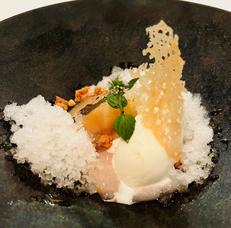 桃のコンポートとジェラート、ミントとレモングラスのグラニテ。名残りの夏をそっと閉じ込めたような優しい甘さ。