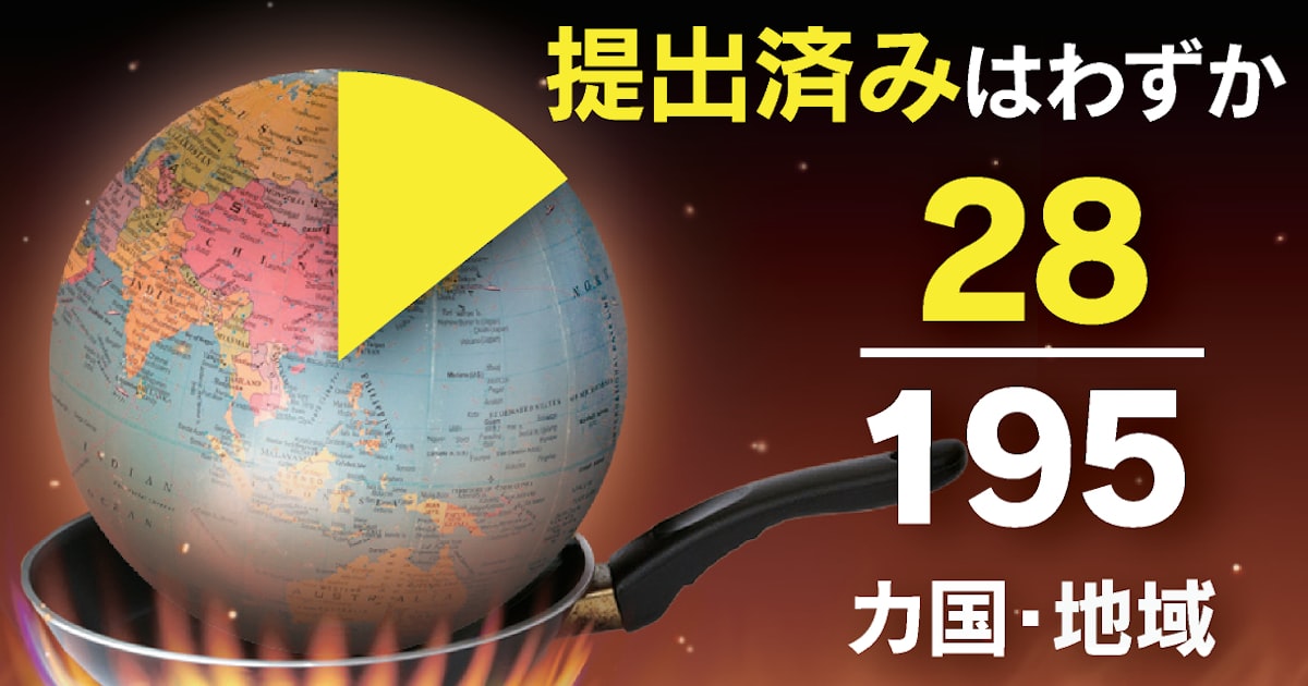 国連気候変動枠組み条約(UNFCCC)事務局によると、10日時点で35年時点の削減目標を含むNDCを提出したのは日本や英国、カナダなど28カ国にとどまった。パリ協定に加盟する195カ国・地域のうち、8割以上がまだ提出していない。未提出の中には、二酸化炭素(CO2)排出量の多い中国、欧州連合(EU)、インドも含まれる。