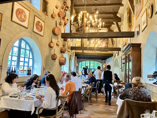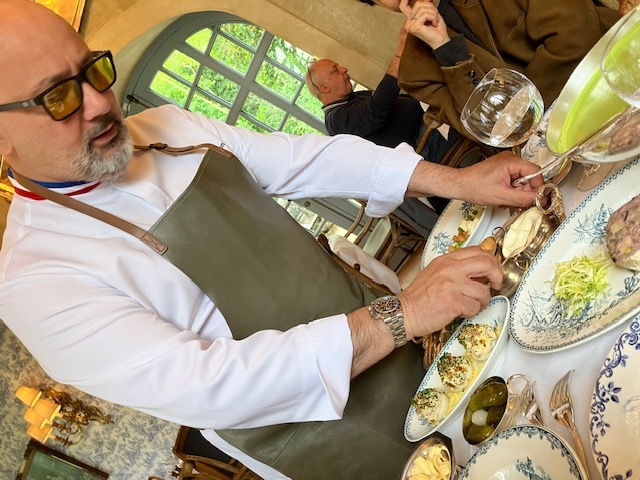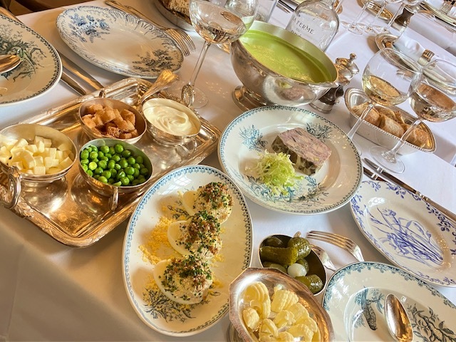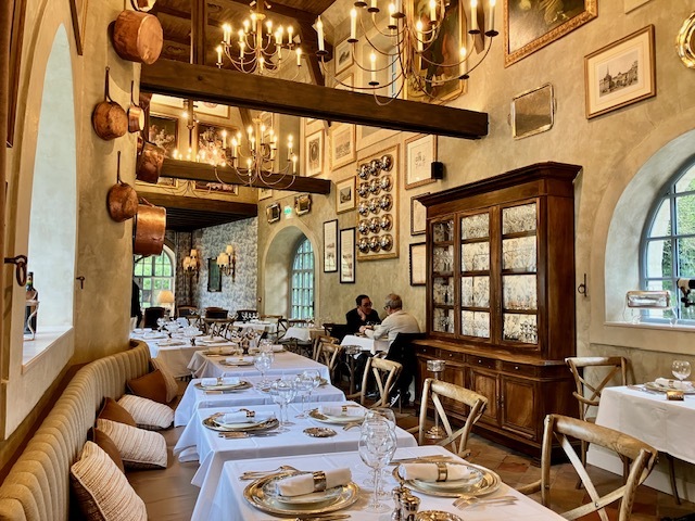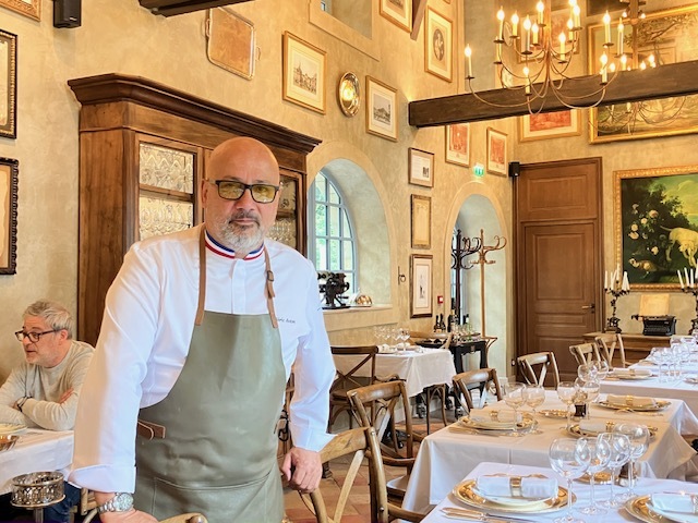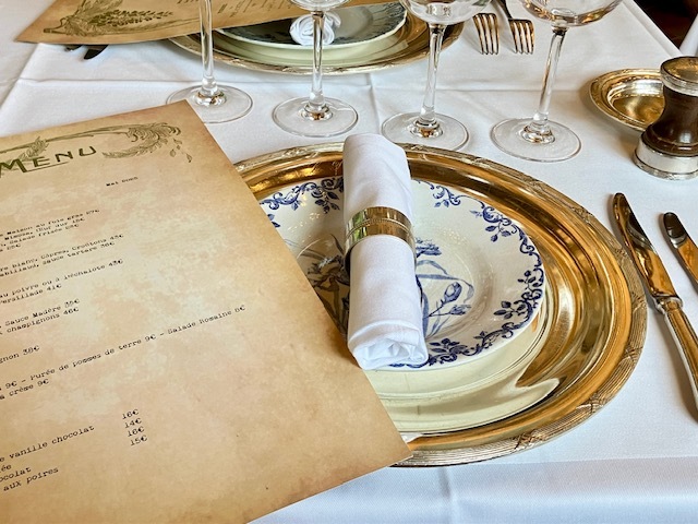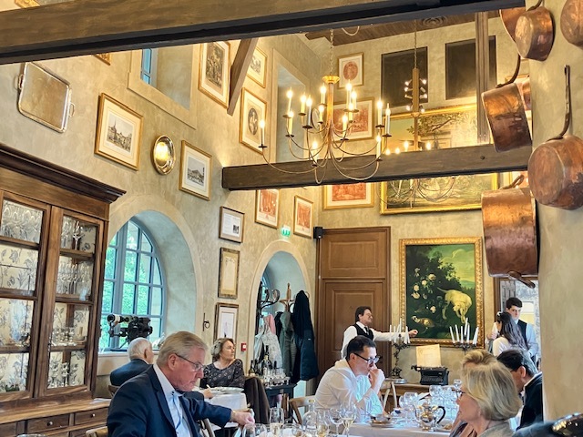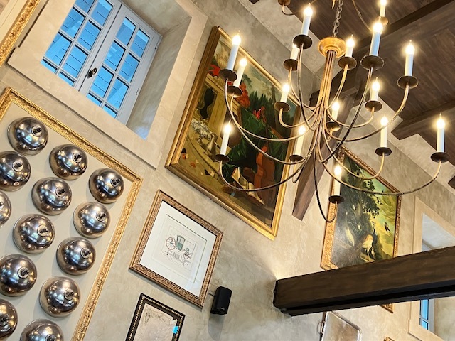 ノルマンディの農家を、プレ・カトラン流にシックにアレンジした、という感じ。壁をおおう絵画やオブジェは、プレ・カトランに眠っていたものがほとんど。テーブルのカトラリーや塩胡椒入れも、昔、お向かいで使ってたものなんだよ、と、顔見せに来てくれたフレデリックが教えてくれる。