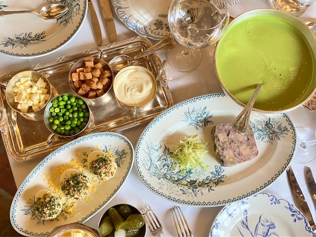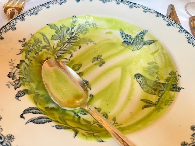 どれから食べようかおろおろしてると、フレデリックがやってきて、熱々のスープ皿に、バターやクリームやグリーンピース入れて、スープ注いてくれる。”熱いうちにたべなよ”、”ウィ、シェフ”。
