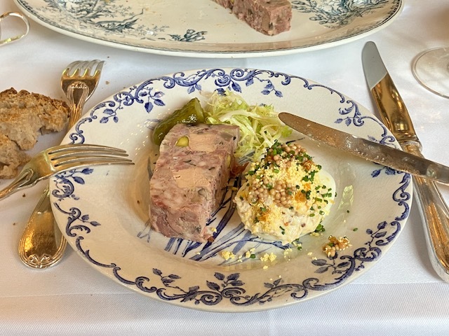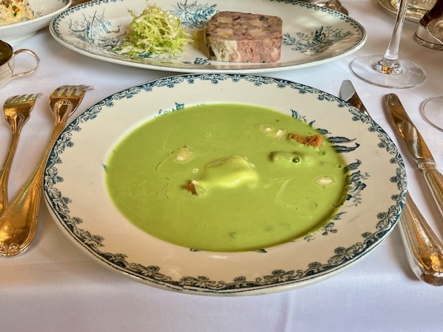 おっきなシルバーボウルにたっぷり入ってきた緑鮮やかなスープに歓声。クルトンやクリーム、グリーンピースが別添えなのが、とっても素敵。続いて、おまけです、と、テリーヌと鶏&卵が運ばれてくる。ひゃ〜、おいしそうなテーブル見ているだけで、食友も私もテンションマックス♪