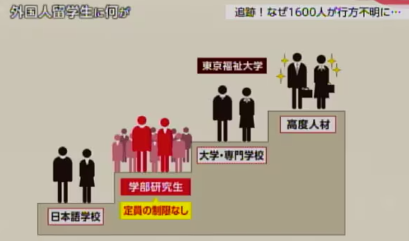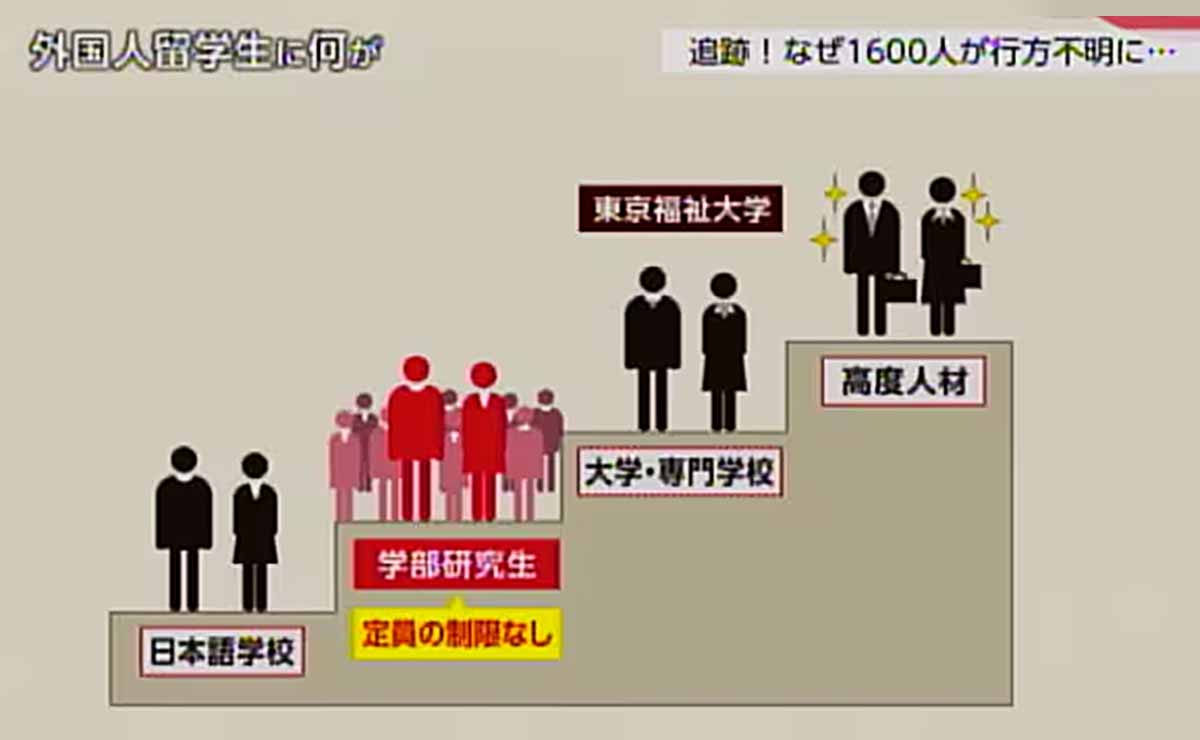 東京福祉大学が補助金を見込んで大量に行方不明になることを前提にしていたとしか思えない定員を遙かに超える外国人留学生を入れていて大量に不法滞在~不法就労にクラスチェンジする目的の失踪者を出していたことがバレて問題となりました。