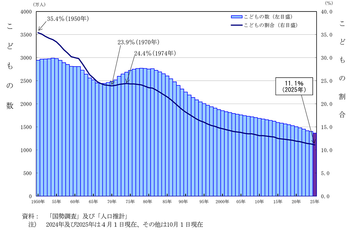 さらにこのベビーバストを拡大解釈して、直近の50年間を含めると、15歳未満の「こども数」(年少人口数)は44年連続の減少であり、2025年8月1日現在の速報値で1354万人(総人口の11.0%)になったことがあげられる。合わせて、図1の1980年前後から2024年までの約50年間もベビーバストと見なせば、より一層その深刻さが伝わってくる。