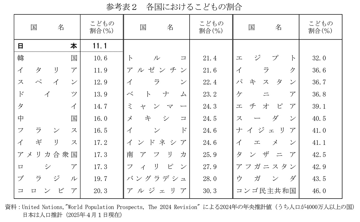 もう一つは表2に見るように、国連加盟国のうち人口総数が4000万人以上の37カ国のなかで、日本の子どもの割合が36位になったことである。