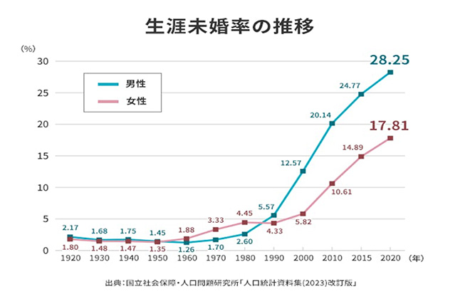 ちなみに、2023年3月段階での日本全体の未婚者は32,790,076人であり、図2のように生涯未婚率は2020年段階で、男性が28.25%、女性が17.81%と算出されている(国立社人研、2023)。