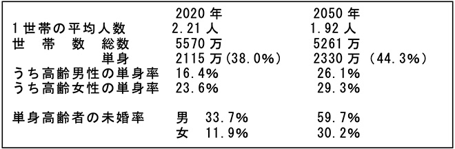 これも織り込み済みだが、「単身世帯」が2020年の2115万世帯(38.0%)から2050年には2330万世帯(44.3%)へと急増することは大きな変動だから、政財界やマスコミ界それに学界など各方面で正対したい。本書もこの立場にある。