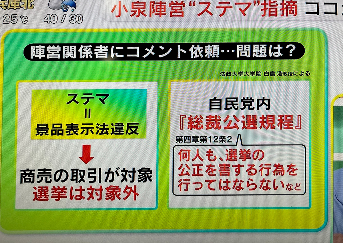 ②は、某地上波情報番組で大々的に解説していたが、トンチンカンである。いかにも地上波らしい→視聴者を小バカにしている。問題の捉え方がまちがっている。小泉陣営のお粗末な、ある意味辟易するヤラセを〝ステマ(景品表示法違反)〟に擬しただけであって、この指摘は全く本質的でない。ポエムにならって擬しやすいワードを選んだだけだ。