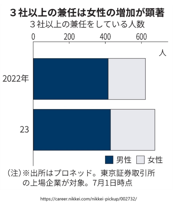 女性役員の人材は決して潤沢ではなく、複数企業を兼任する例が増えています。特に数値目標が掲げられて以降、兼任の傾向は顕著に見られます。例えば元アナウンサーの福島敦子氏や菊間千乃氏はそれぞれ4社を兼任していて、各社の経営にどこまで深く関与できるのか、疑問視する声も少なくありません。