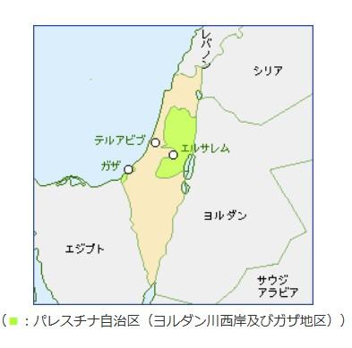 以下はイスラエルを示す地図(外務省サイトから)だが、薄い黄色の部分がイスラエル、緑色が「パレスチナ自治区」。パレスチナ自治区は海岸沿いの「ガザ地区」、ヨルダン寄りの「ヨルダン川西地区」の2つの地域で構成されている。