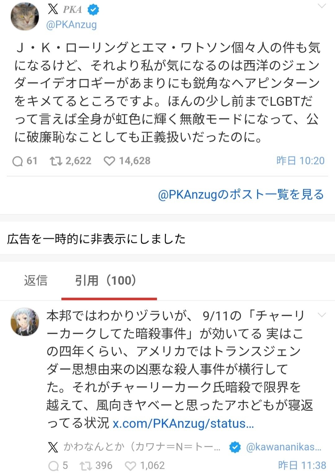 ではどこか。既報のとおり日本の「オープンレター」も含めて、世界のキャンセルカルチャーを長らく駆動してきたトランスジェンダリズムが、ついに政治的な暗殺を生んだ可能性がある。だから、ここまでハレーションを呼んでいるのだ。