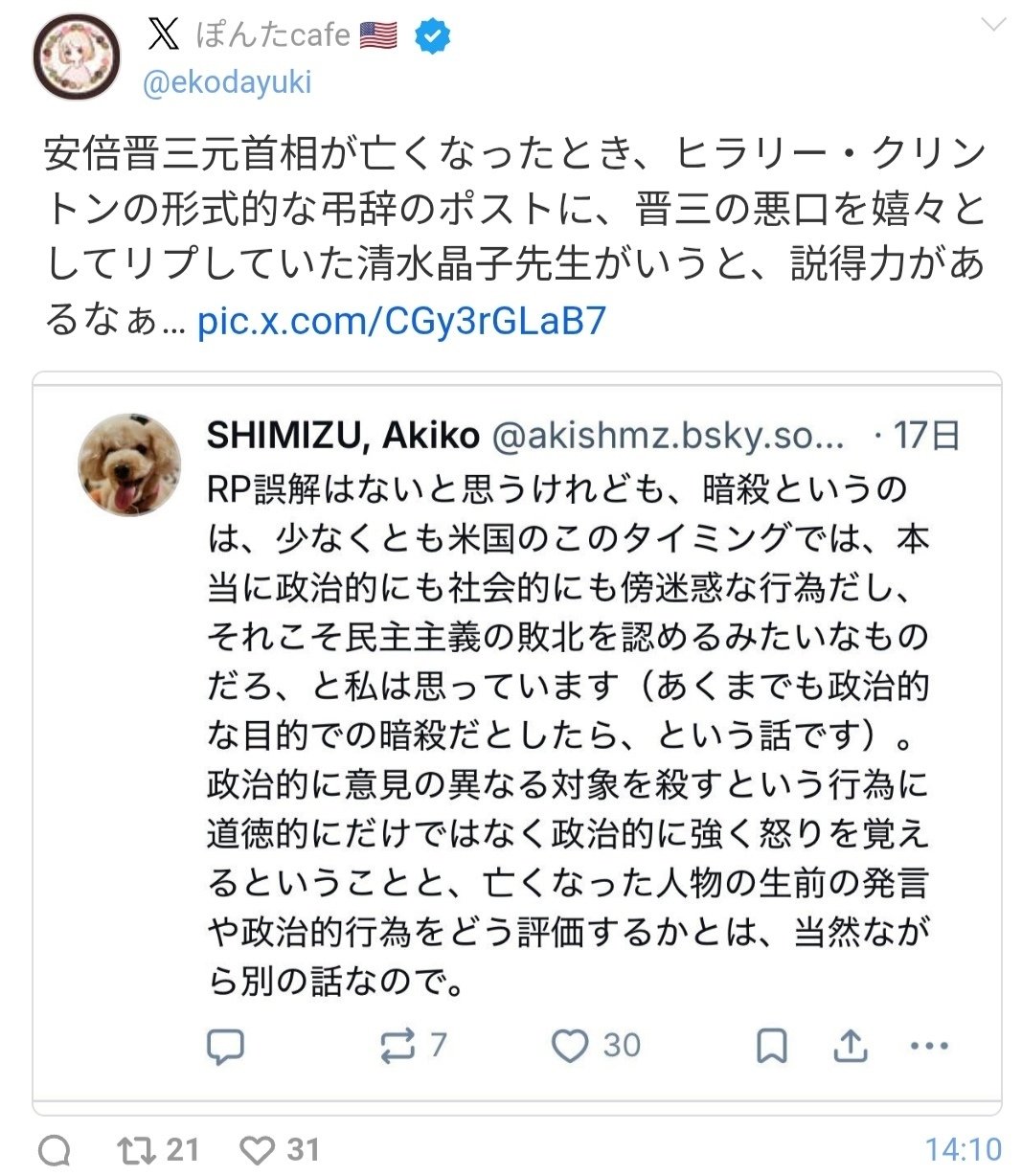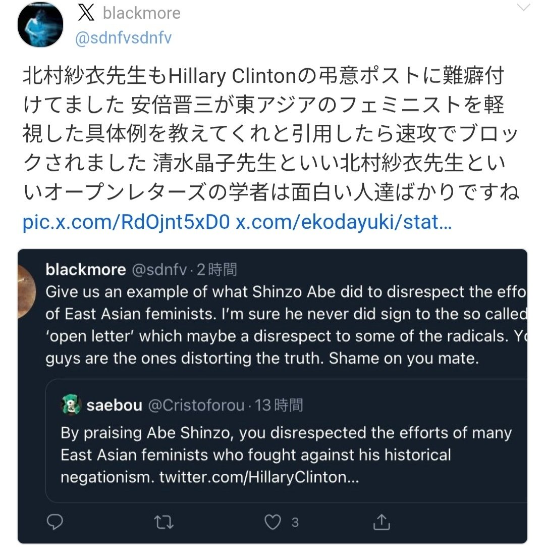 2022年7月の安倍晋三元首相射殺後のこの人の所業は、以下にまとまっている。なお同じ年の3月、ウクライナ戦争の序盤にも、「プーチンもローリングを擁護してるから、オープンレターの批判者はプーチンと同じだ」と歓喜する発言をしていた。
