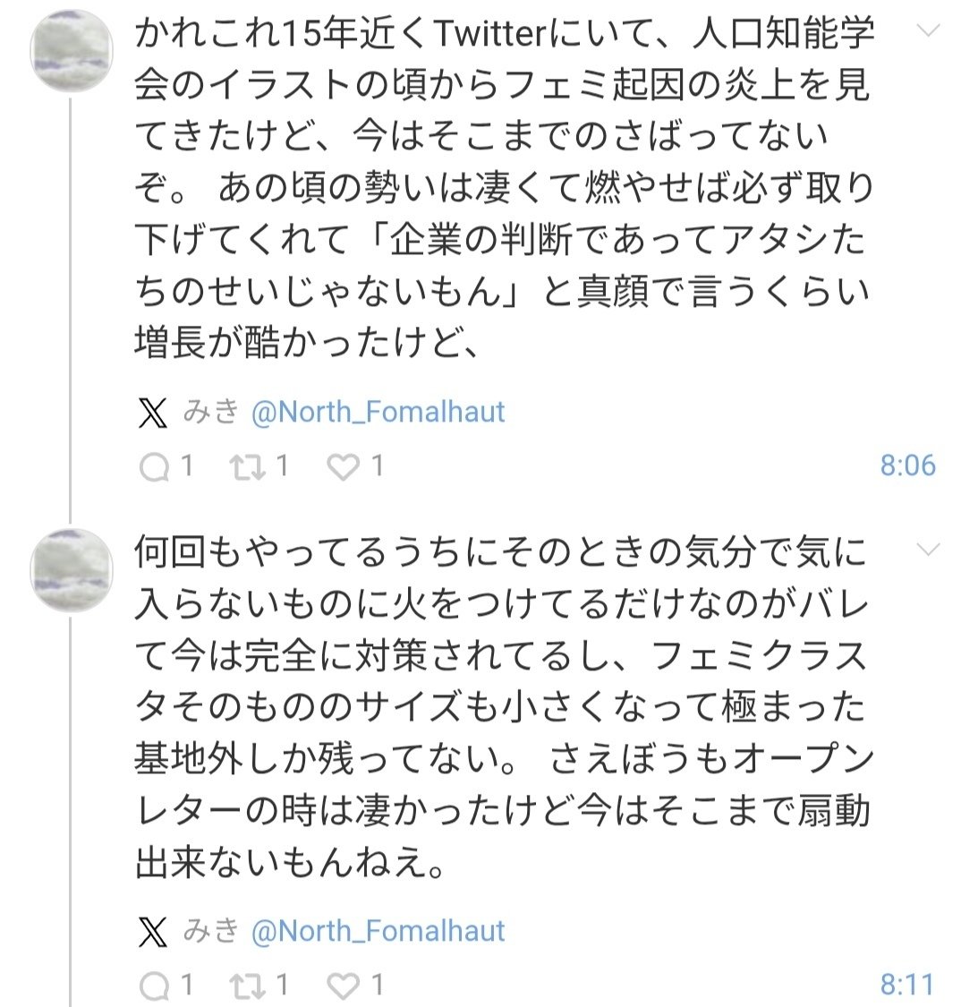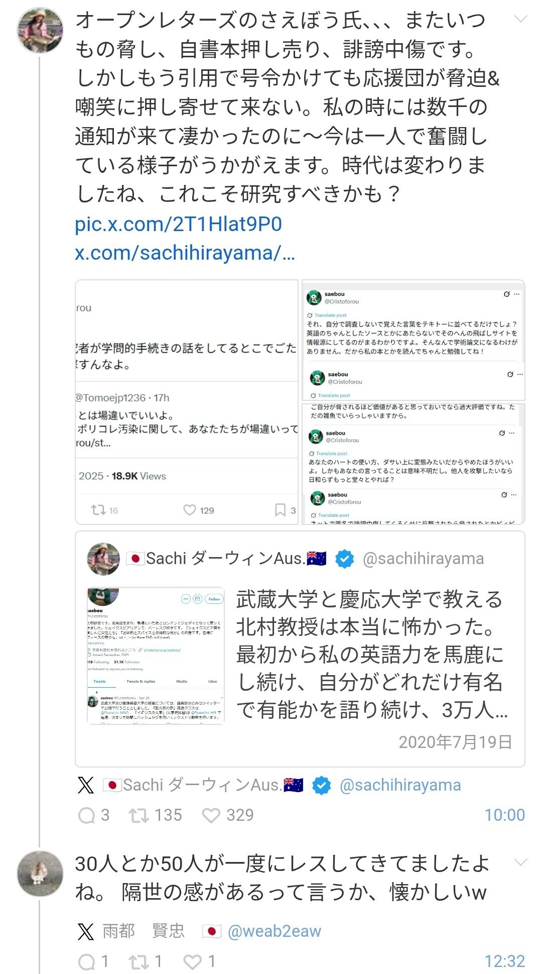 レターが出るきっかけを作った北村紗衣氏のXの使い方が、短い語数で「勝ったふり」だけするヘタの横好きなことは、前に以下の記事で書いた。ところが最近は公然と「レスバに負ける」姿を見せて、広く笑われている。