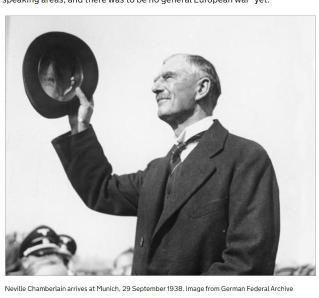 1938年9月29日、ミュンヘンに到着するチェンバレン英首相(英政府サイトよりキャプチャー)(German Federal Archive)