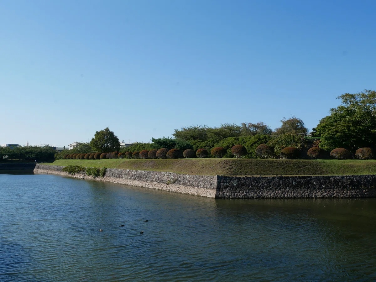 堀を作る石垣は日本の城に多い直角ではない鈍角の形状。非常に興味深いのですが、やはり形が売り物の建物や城郭をよく知るためには高いところから眺めるのが一番よくわかります。同じことは大阪などにある大規模な古墳にも言えます。平面からだと目の前にあってもその凄さがわかりにくいです。