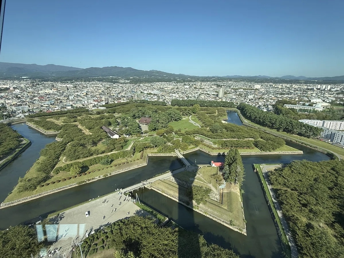 展望フロアに登ると、見えました!星形の独特の形をした城郭。これが函館を代表する観光名所「五稜郭」です。