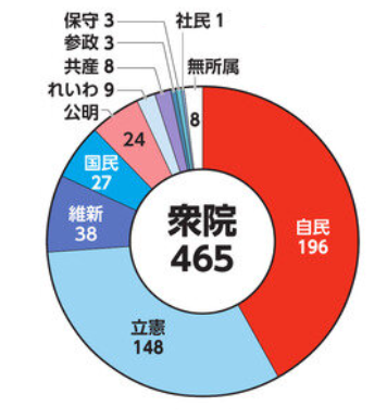 - 参院多数を握る自民(および公明)との協調が必須で、短命内閣か、解散・総選挙になる公算が大きい。