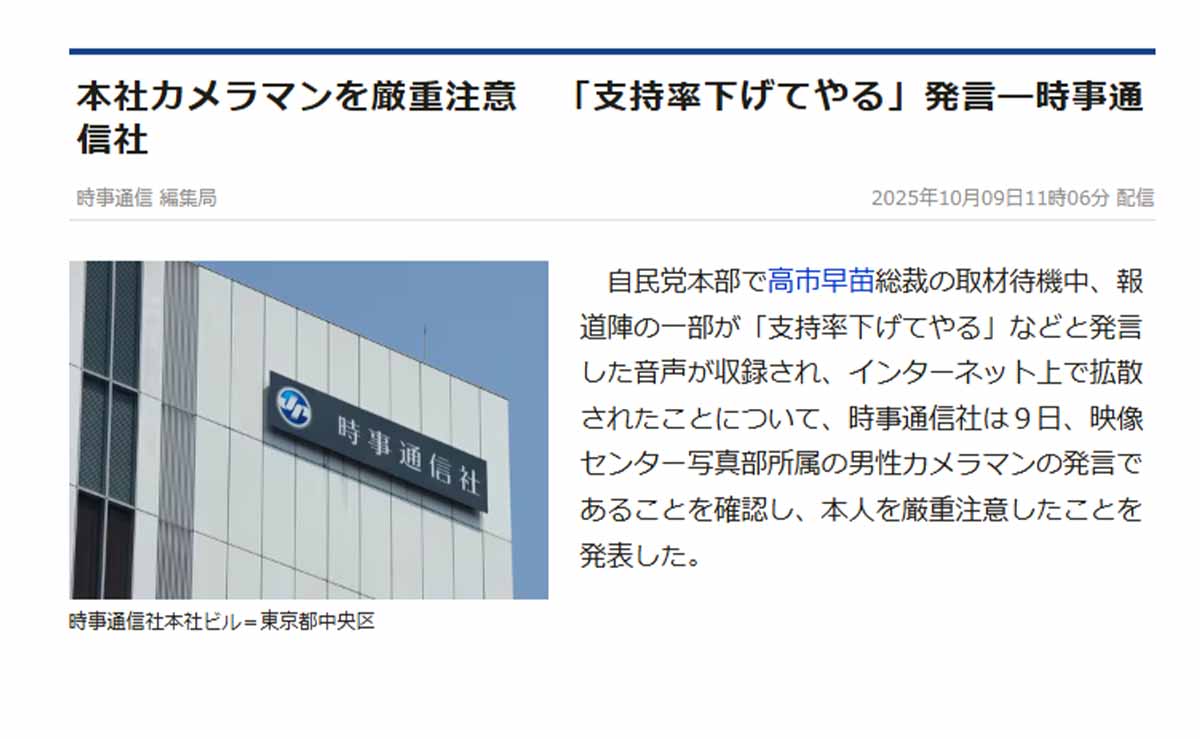 自民党総裁・高市早苗氏の会見前、「支持率下げてやる」との発言が報道現場から聞こえたとして批判が広がった。音声がSNS上で拡散し、発言者が時事通信社のカメラマンであったことが判明。報道機関の中立性・信頼性が問われる事態となった。