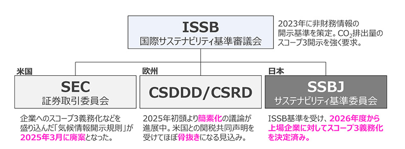 ISSB基準を受けて欧州で議論されているCSRD/CSDDDは事実上骨抜きとなり、米国ではSEC(証券取引委員会)が進めてきた気候関連情報開示規則が今年2月に廃案となりました。一方で日本は金融庁が所管するSSBJ基準ができました。この点が分かりづらいというご指摘をいただいたので、簡単なポンチ絵をつくりました。