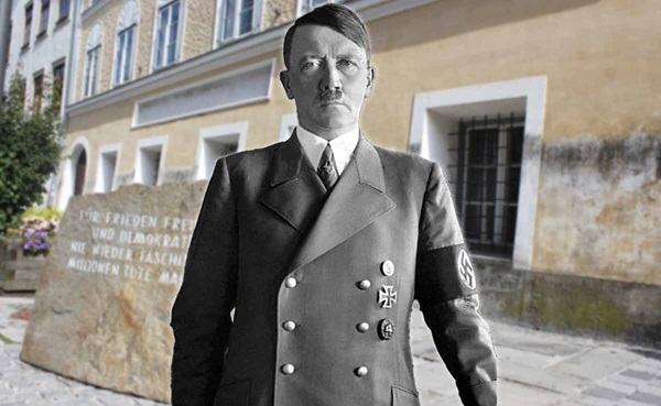 ヒトラーの生家とその前に設置された石碑。 石碑には「ファシズムを繰り返すな」と刻まれている。Wikipediaより