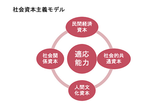 私の「民間経済資本」は金融資本や健康資本などを包括するが、資本主義なのだから、これに社会的共通資本、社会関係資本、人間文化資本を加えて、それらの「適応能力上昇」(adaptive upgrading)こそが、「未来シナリオ」と同じく「厳密な論証と想像の交錯」(福島、2019:4)としての社会資本主義を推進させる社会経済エンジンとした(金子、2023:118)。