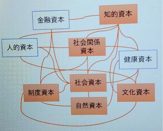 渡邊氏の講演で使用された資本概念(図3)は9種類に達するために、相互に絡み合っており、どのようなつながりをもつのかが分かりにくい。また、宇沢が分類した三種類の社会的共通資本それぞれはストックであり、それゆえに独占的な豊かさをフローとして生み出すとされた。