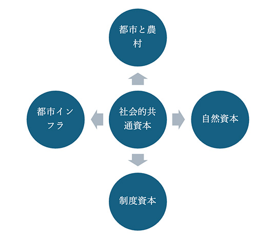 つまりは自然資本を加えた次元がすべて異なる三種類を一括して「社会的共通資本」と呼び、この三者間の関連についての考察が十分に展開されないままに現在に至っている。