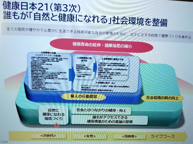 公衆衛生学の立場から近藤氏は、厚生労働省「健康日本21(第3次)」を紹介しながら、「健康寿命の延伸・健康格差の縮小」のためには、「個人の行動変容」と「社会環境の質の向上」が重要であることを、いくつかの資料を提示しながら強調された。その「社会環境」の核となるのが「社会的共通資本」であった。