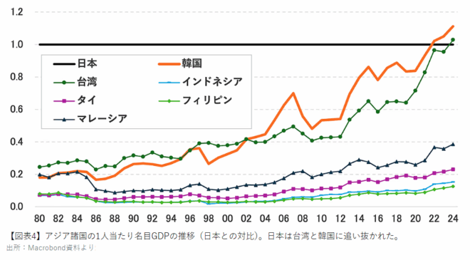 IMFの世界経済見通しによれば、2024年の一人当たり名目GDPは日本が約3万3000ドル、韓国が約3万6000ドルで、韓国が日本を抜いた。この一つの要因は急激な円安だが、ここ10年の成長率をみても逆転されるのは時間の問題だった。