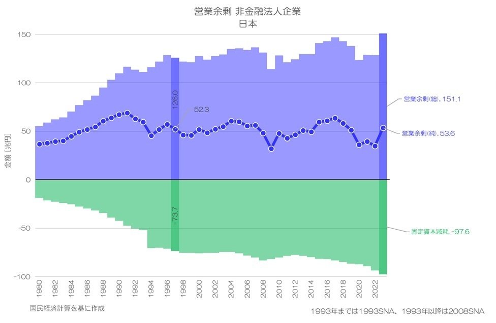 更に営業余剰(総)から、減価償却費に相当する固定資本減耗を差し引いたのが、企業の手元に残る正味の営業余剰(純)となります。