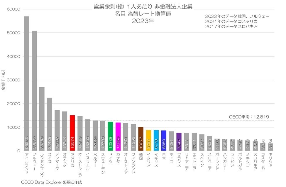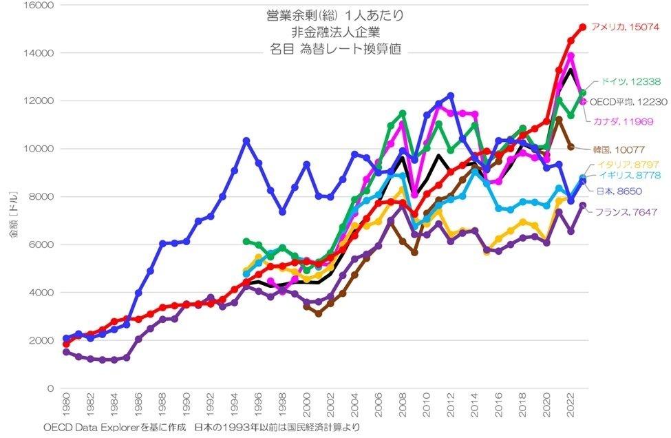 まずは、人口1人あたりの企業の営業余剰(総)ドル換算値を見てみましょう。