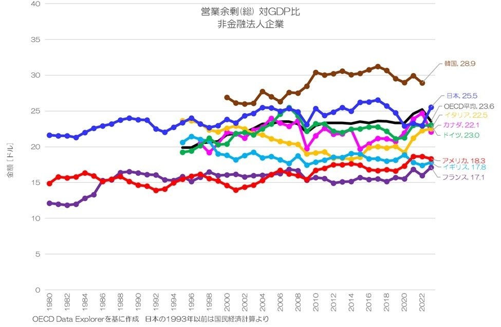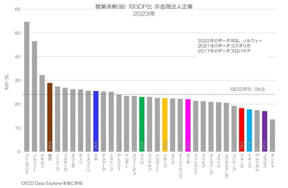 この記事では、生産により生み出された付加価値のうち、企業への分配の合計となる営業余剰(総)を国際比較します。