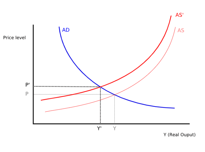 インフレは総需要(AD)が総供給(AS)を上回ったとき起こります。総供給が減って(AS曲線が左にシフトして)AS’になると、物価はP’に上がります。