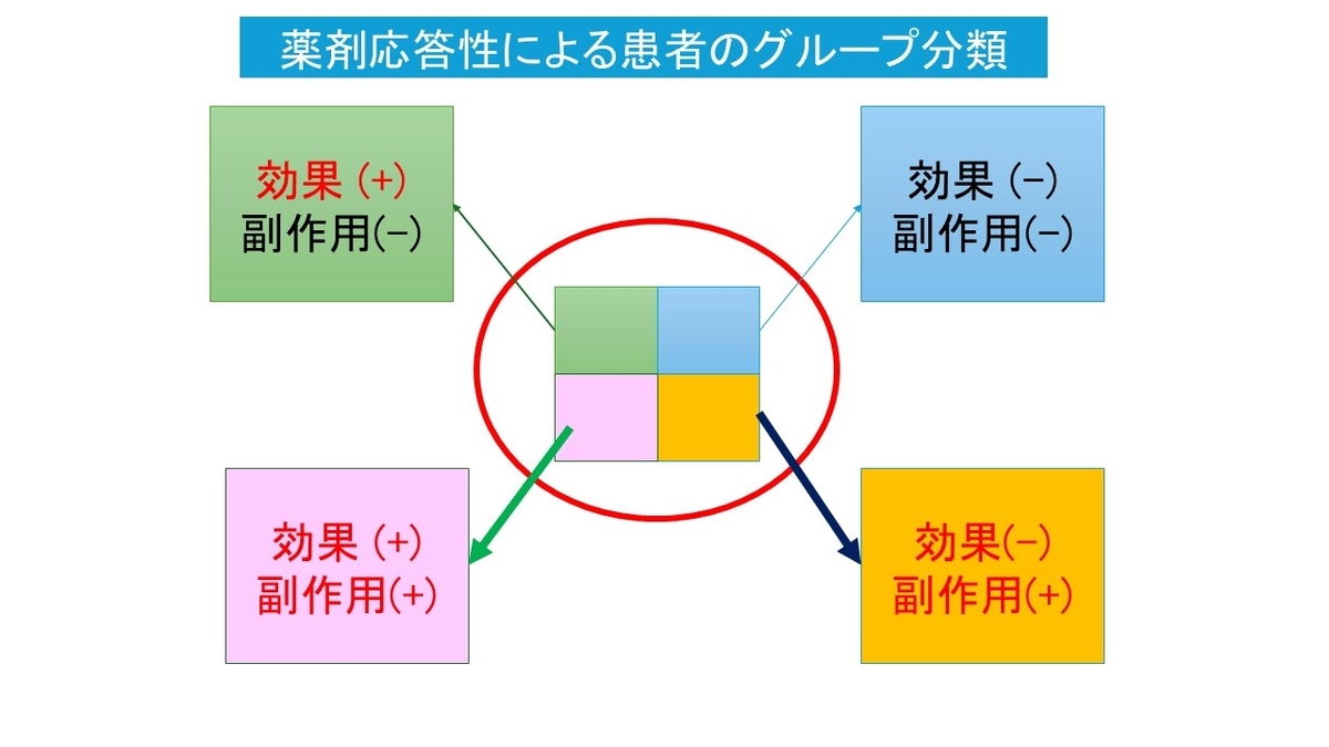 下記の図は、患者さんの薬に対する反応性を大きく4分類した図である。効果と副作用の有無で4分類したが、左上のように、効果があり、副作用がなければ投与しても何の問題もない。右のように効果がなければ投与する意味がない。ほぼすべての薬は左下の図のように両方プラスだが、効果が副作用よりも格段に優れていれば、あるいは、少々副作用が強くとも他に選択肢がなければ投与するメリットがある。