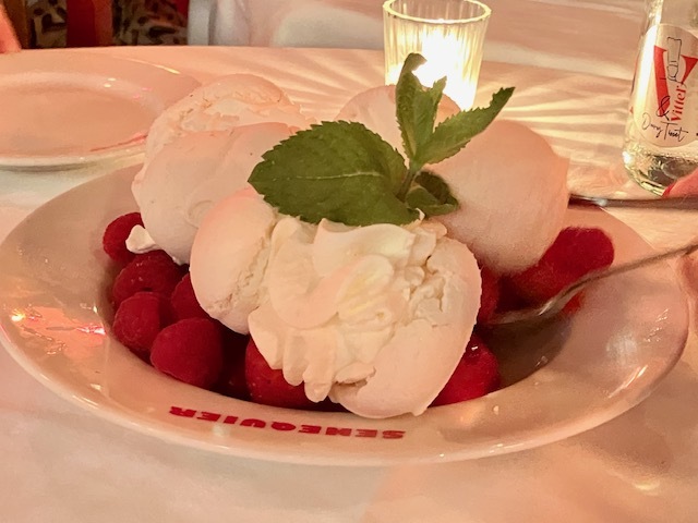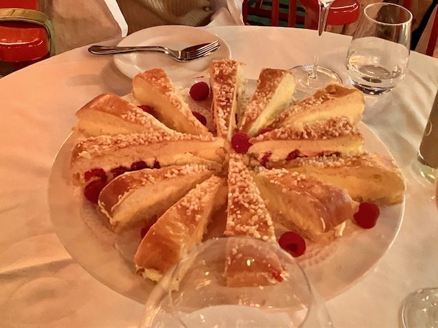 最後は名物タルト・トロペジエンヌと、春の赤い果物&メレンゲ&クリーム(フランス人、こういうデセール大好きね)。