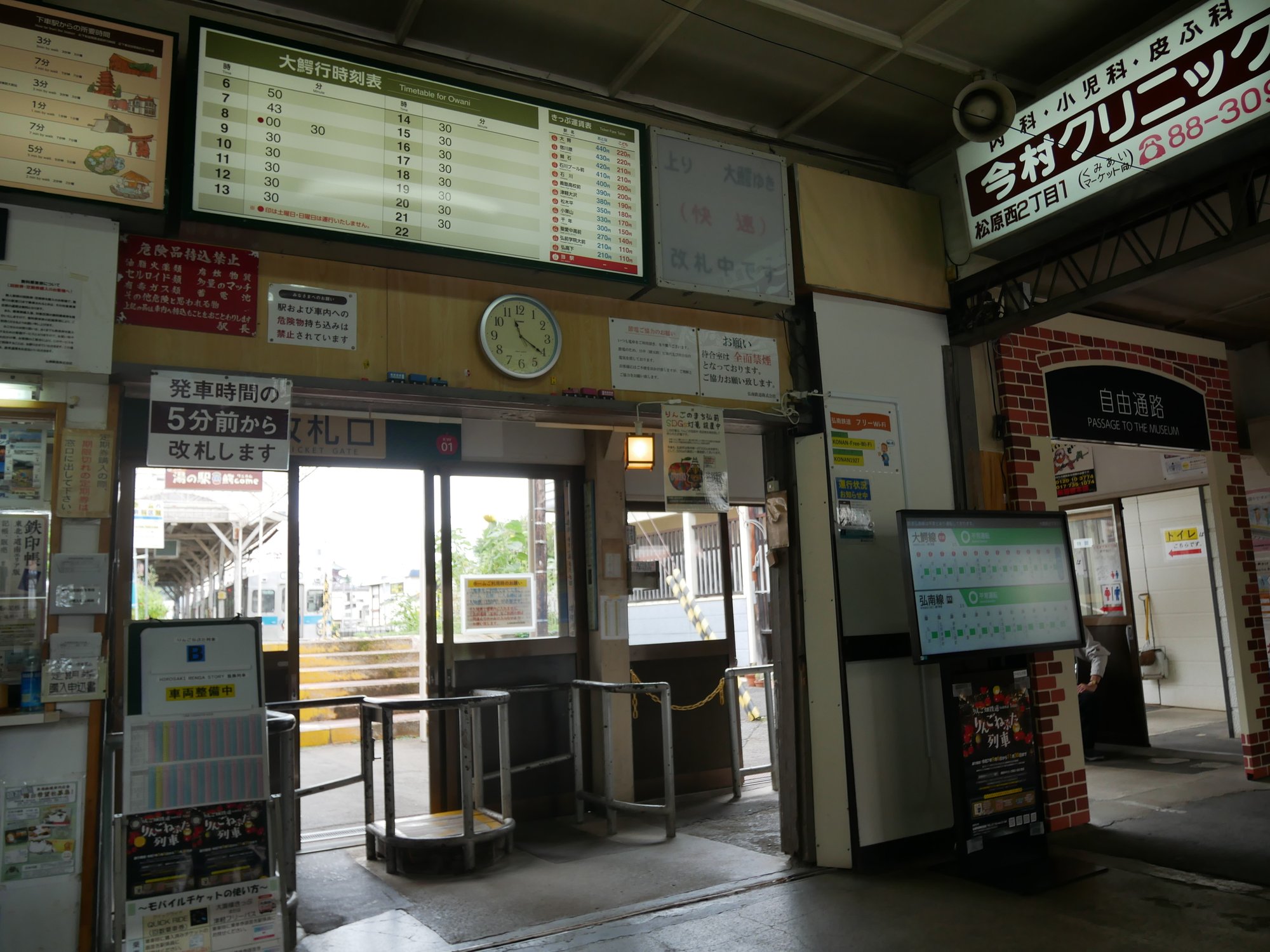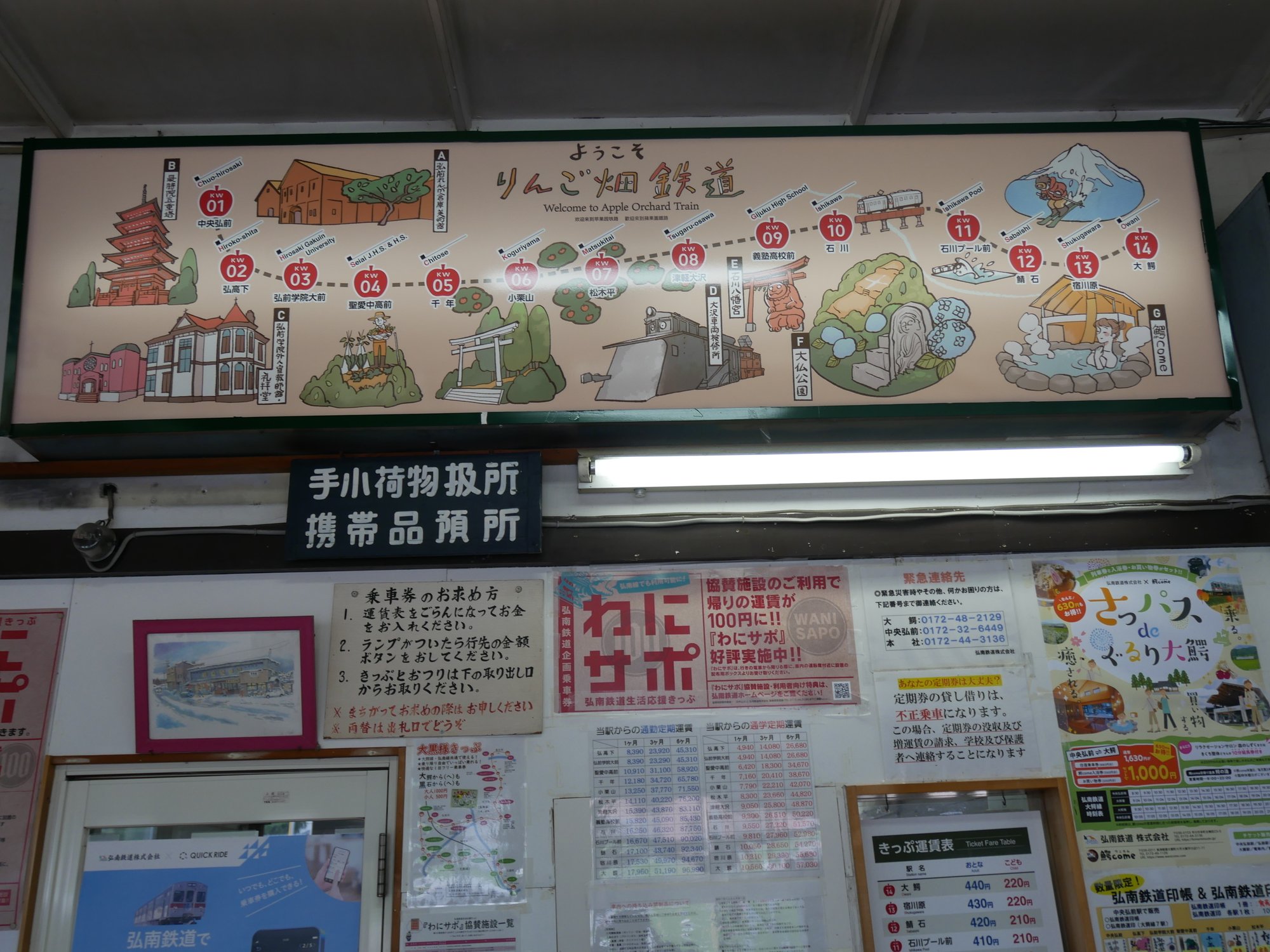 駅舎内には大鰐線の愛称「りんご畑鉄道」の路線図と観光案内が掲げられています。電車に乗って沿線の旅に出られるのももうあとわずかです。