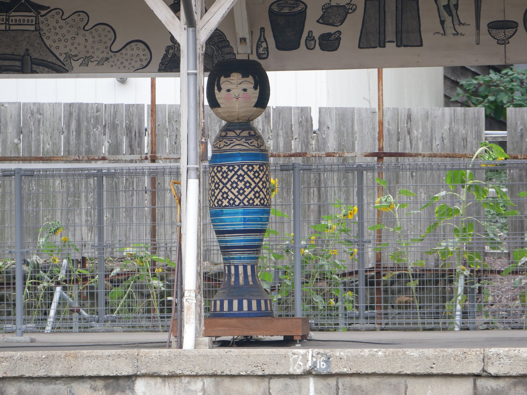 中央弘前駅のホームにはこけしにもマトリョーシカにも似た人形がいます。これは弘南線のある黒石市の工芸品「こけし灯篭」です。黒石ねぷたでは高さ10メートルのこけし灯篭が町を練り歩きます。