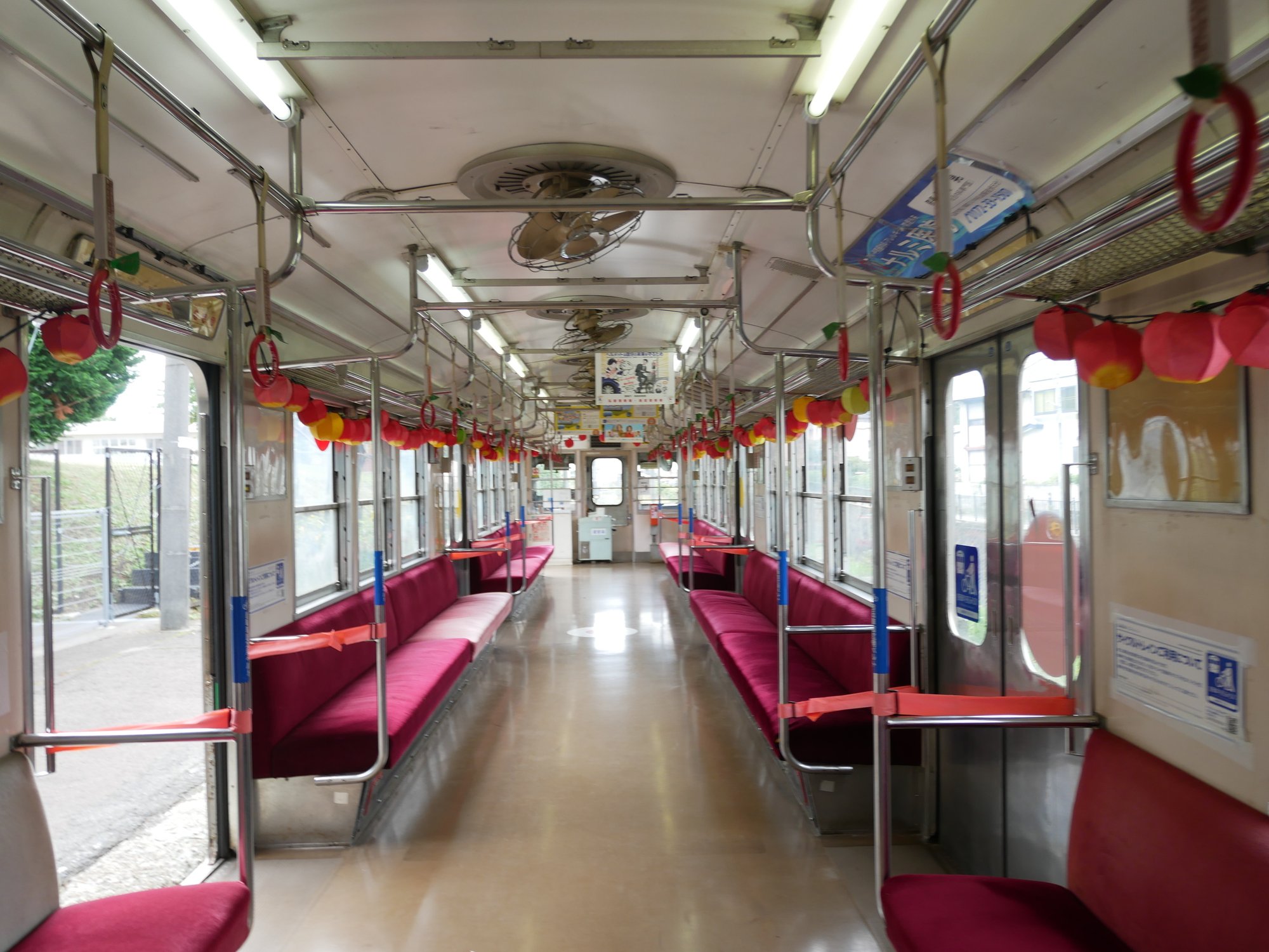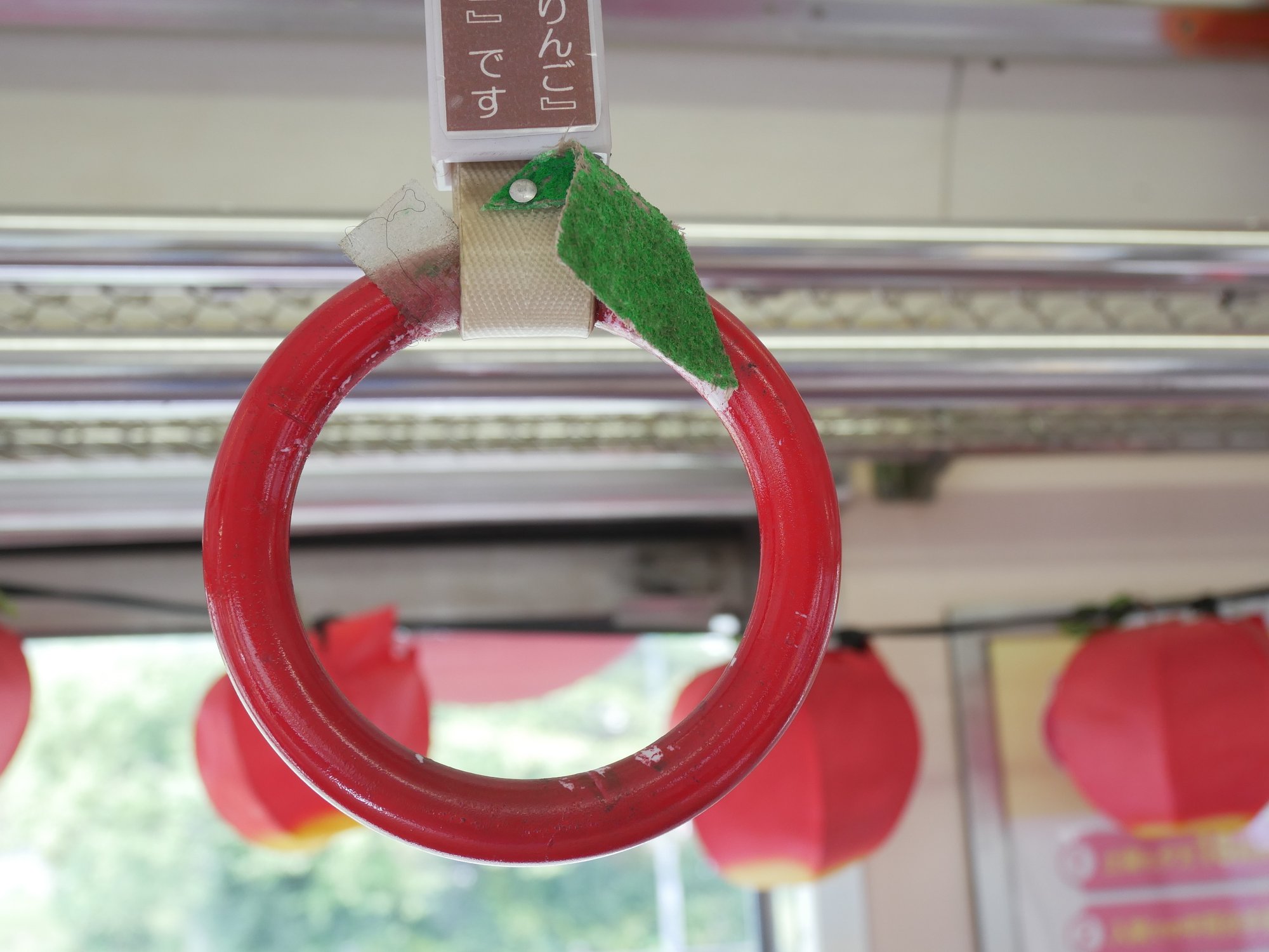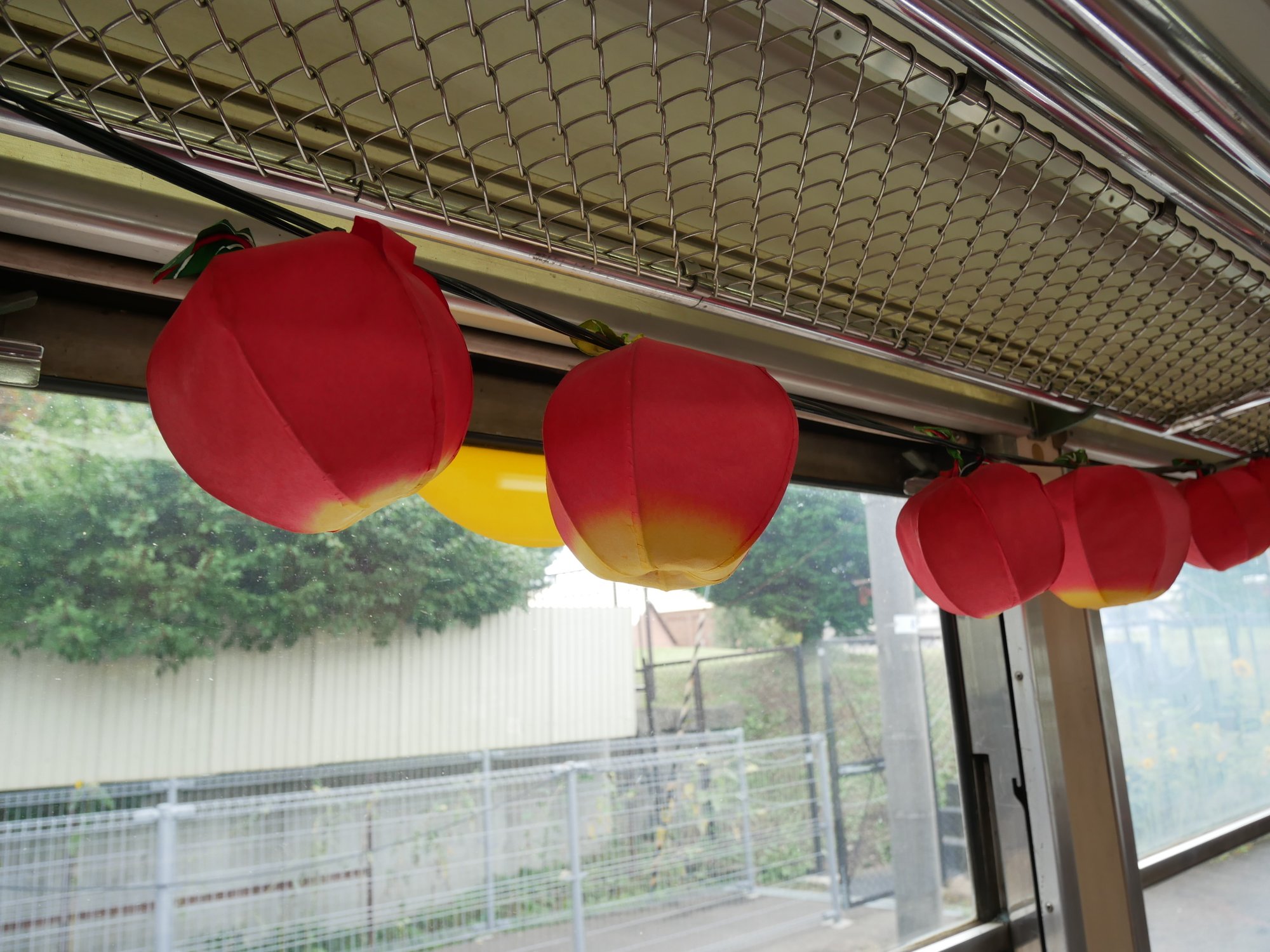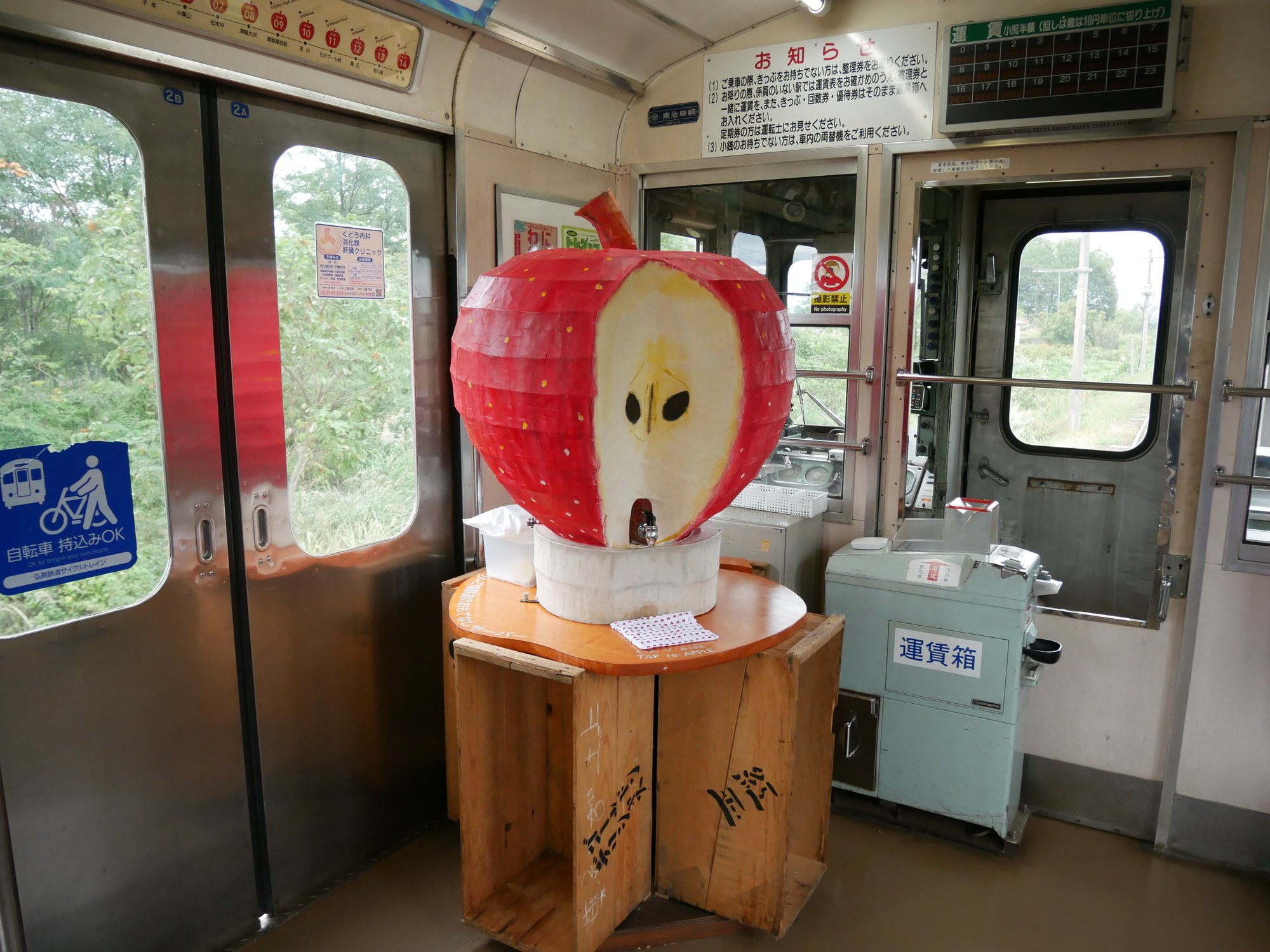 電車の出発が近くなったのでホームに入ります。今年は11月30日まで、りんごねぷた列車と呼ばれるりんごの装飾品が車内に飾られた列車が運行されます。夜にはライトアップされるそうなので、よりねぷた感を感じたい方は夜の列車に乗るといいと思います。