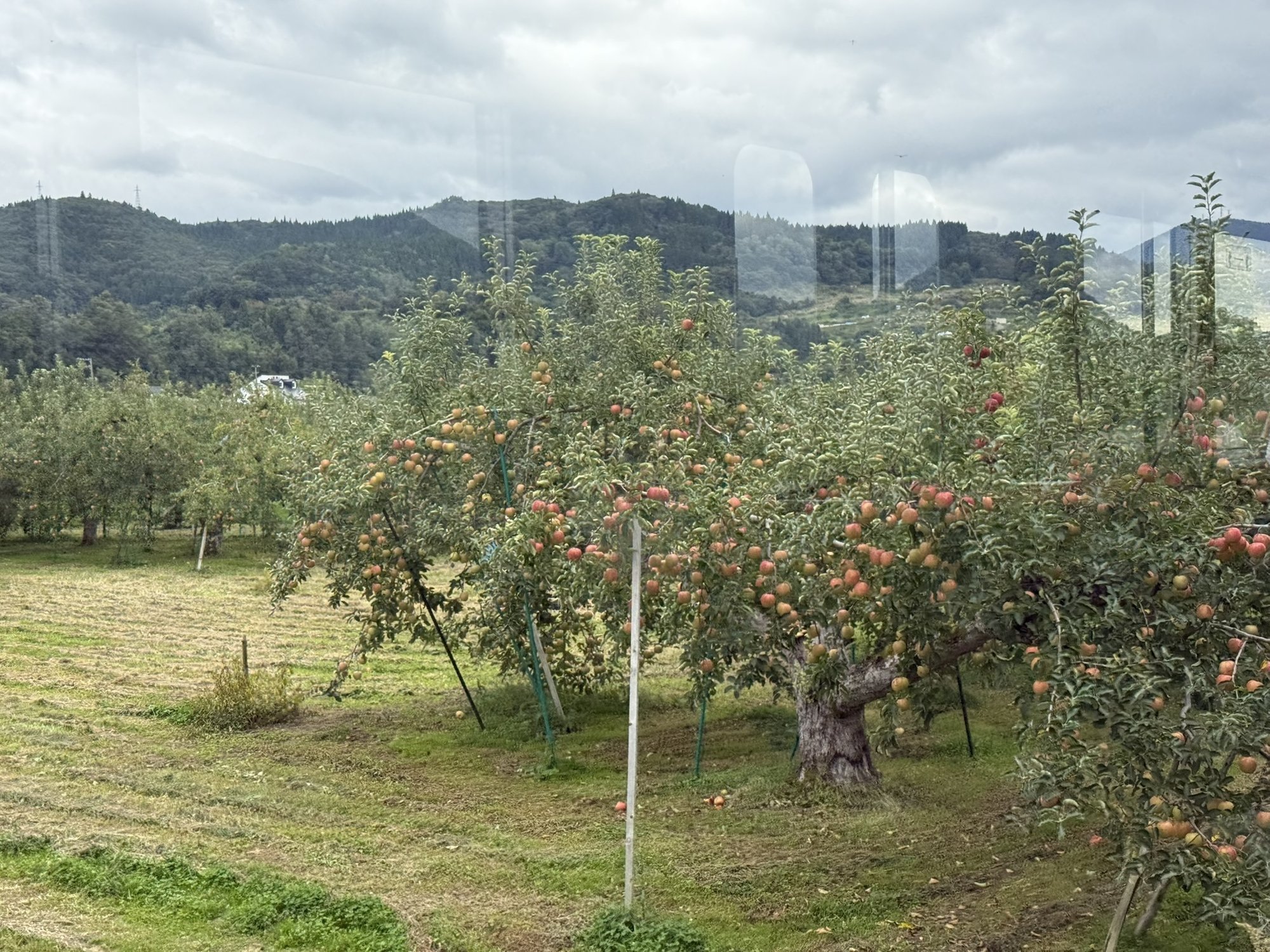 車窓を眺めていると真っ赤なりんごが次々と流れていきます。大鰐線はほぼ全線でりんご畑に出会える、りんご畑電車の名に偽りのない路線です。
