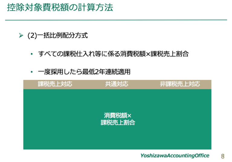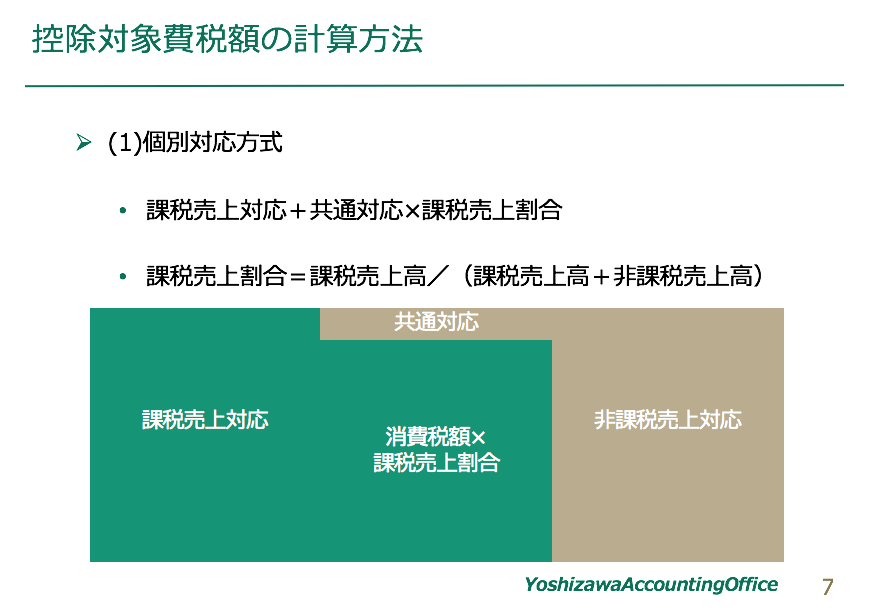 そして、共通対応するものについては、「課税売上割合」(課税売上高/課税売上+非課税売上)を掛けた金額だけ控除が可能とする方法です。
