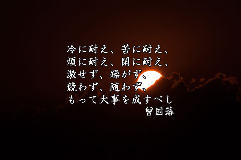 上記の四耐に加えて、彼は「激せず、躁(さわ)がず、競わず、随(したが)わず」という「四不」も、人物を育てる上で非常に大事であると言っています。様々な艱難辛苦(かんなんしんく)を克服して行く中で自らを鍛え上げ、また片方で事上磨錬(じじょうまれん)し知行合一的に実践して行き、恒心(…常に定まったぶれない正しい心)や平常心といったものを涵養すれば、大きな事を成し遂げ得る人物になれる、と言っています。