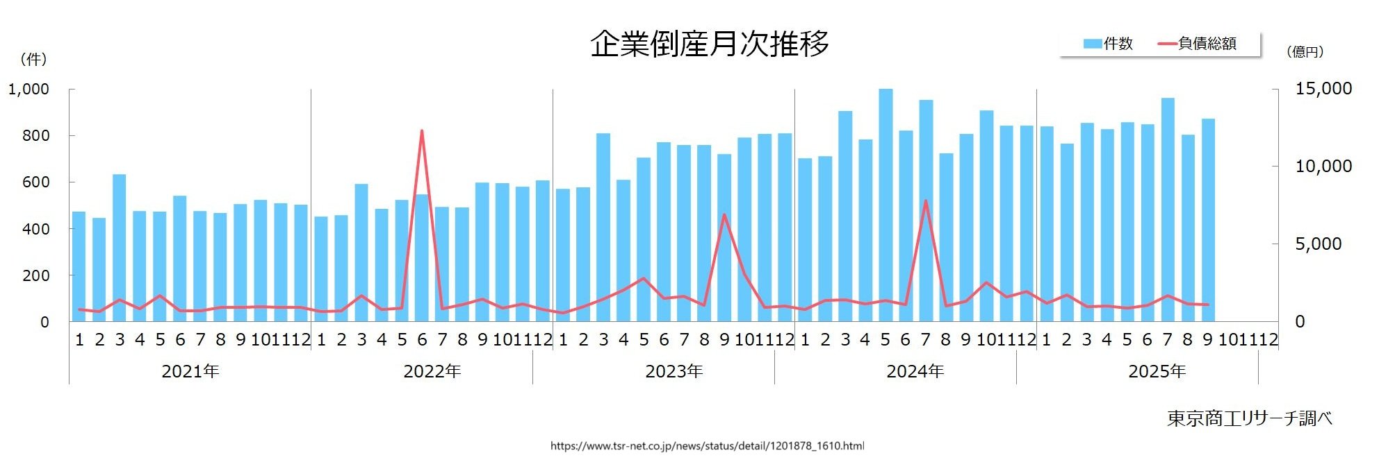 例えば、2021〜2022年はコロナ禍で大不況でしたが、倒産件数は低水準でした。一方今は倒産件数が増加中で、2025年9月の全国企業倒産件数(負債額1000万円以上)は873件で、4年連続で前年同月を上回りました。これはゼロゼロ融資を含む支援策で延命されたツケを払わされている状況で、逆に良い傾向です。