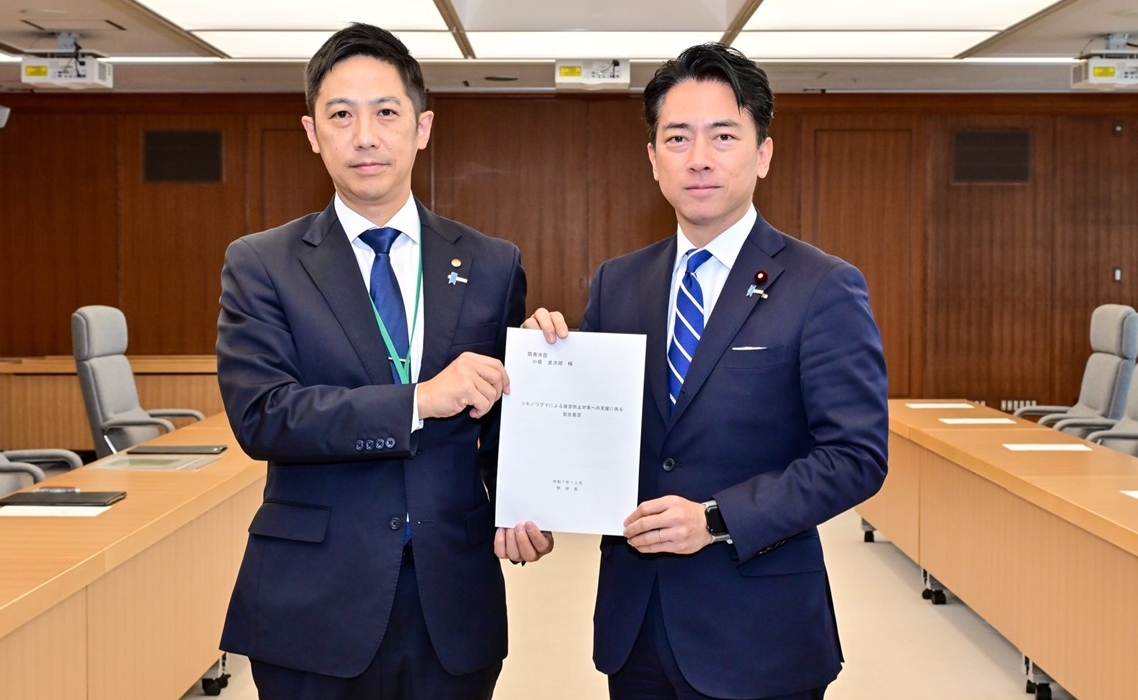 秋田県知事から「ツキノワグマによる被害防止対策への支援に係る緊急要望」を受ける小泉防衛大臣 防衛省HPより