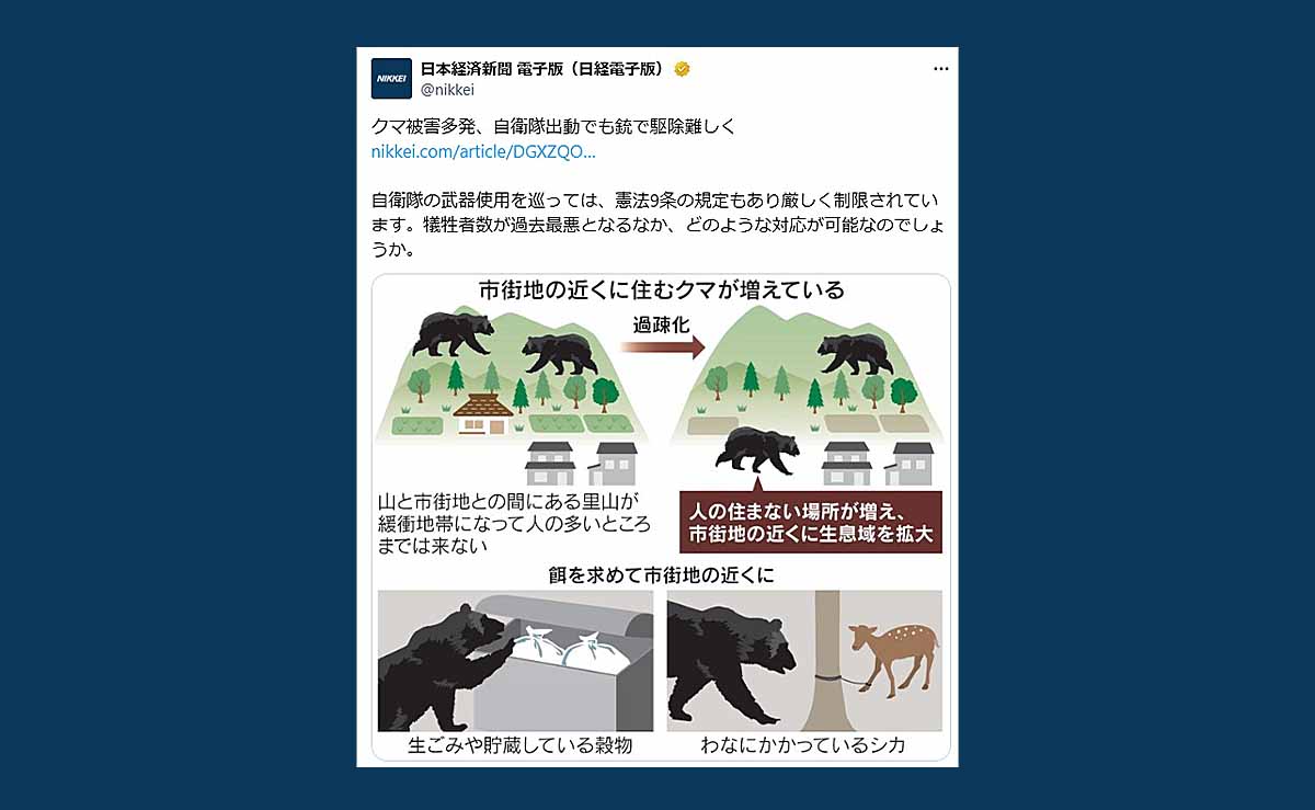 クマ被害多発、自衛隊出動でも銃で駆除難しくhttps://t.co/cPkkQMYG2Y