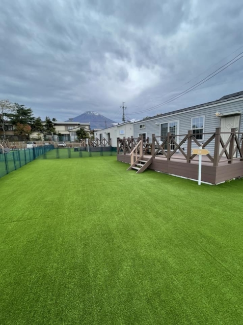完成から3年が経過した物件の建物の前にはそれぞれに人工芝の広い庭があって、ワンコが走り回ることができます。しっかりとした囲いもあるので、安心して遊ばせることができます。