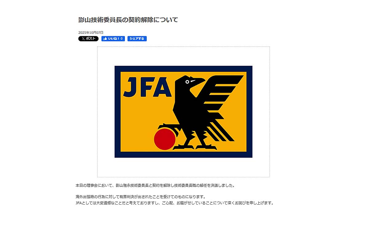日本サッカー協会の技術委員長だった影山雅永氏が、航空機内でiPadで児童ポルノを閲覧していたのを客室乗務員に発見され、フランスで拘束され有罪判決を受けました。これを受けて10月7日に日本サッカー協会(JFA)は影山氏の技術委員長職の解任を決定しました。