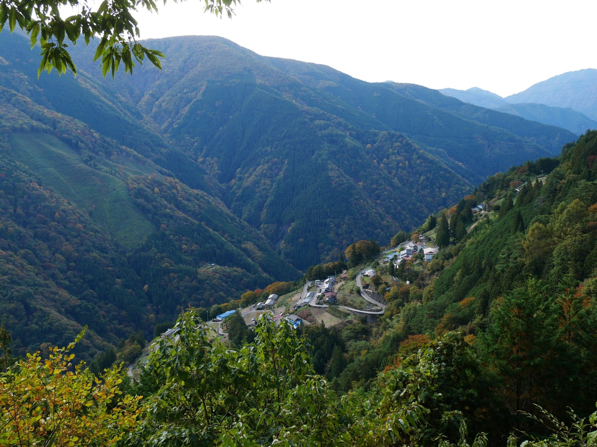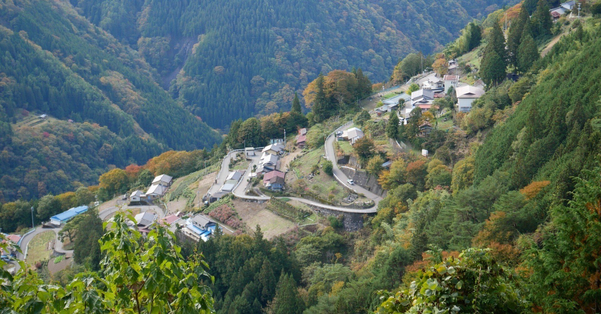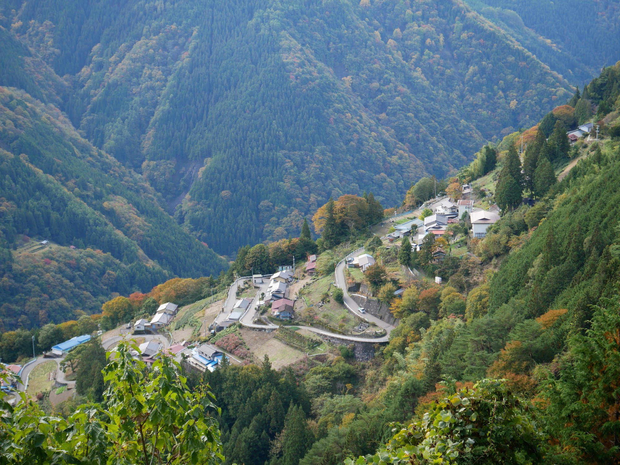 うねうねと集落の中を縫うように走る道路。その道路沿いに民家がありますが、人口は減少の一途をたどり2020年現在の人口は80人。過半数は75歳以上の高齢者です。21世紀後半にはここに住む人はいなくなり、山に還ってしまう可能性もあります。