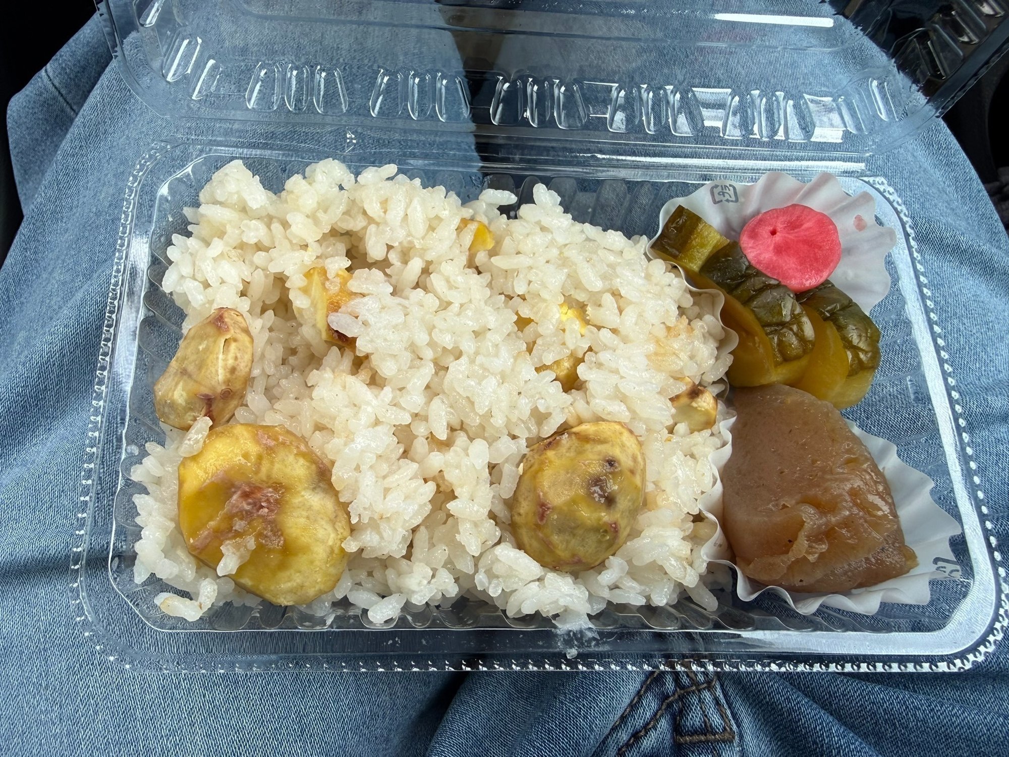 幸い熊には出会わず駐車場に戻りました。駐車場では地元の方がクリご飯を作って販売していました。400円。ごろごろと大ぶりのクリがたくさん入った栗ごはん。これぞ山里の味。おいしく頂きました。