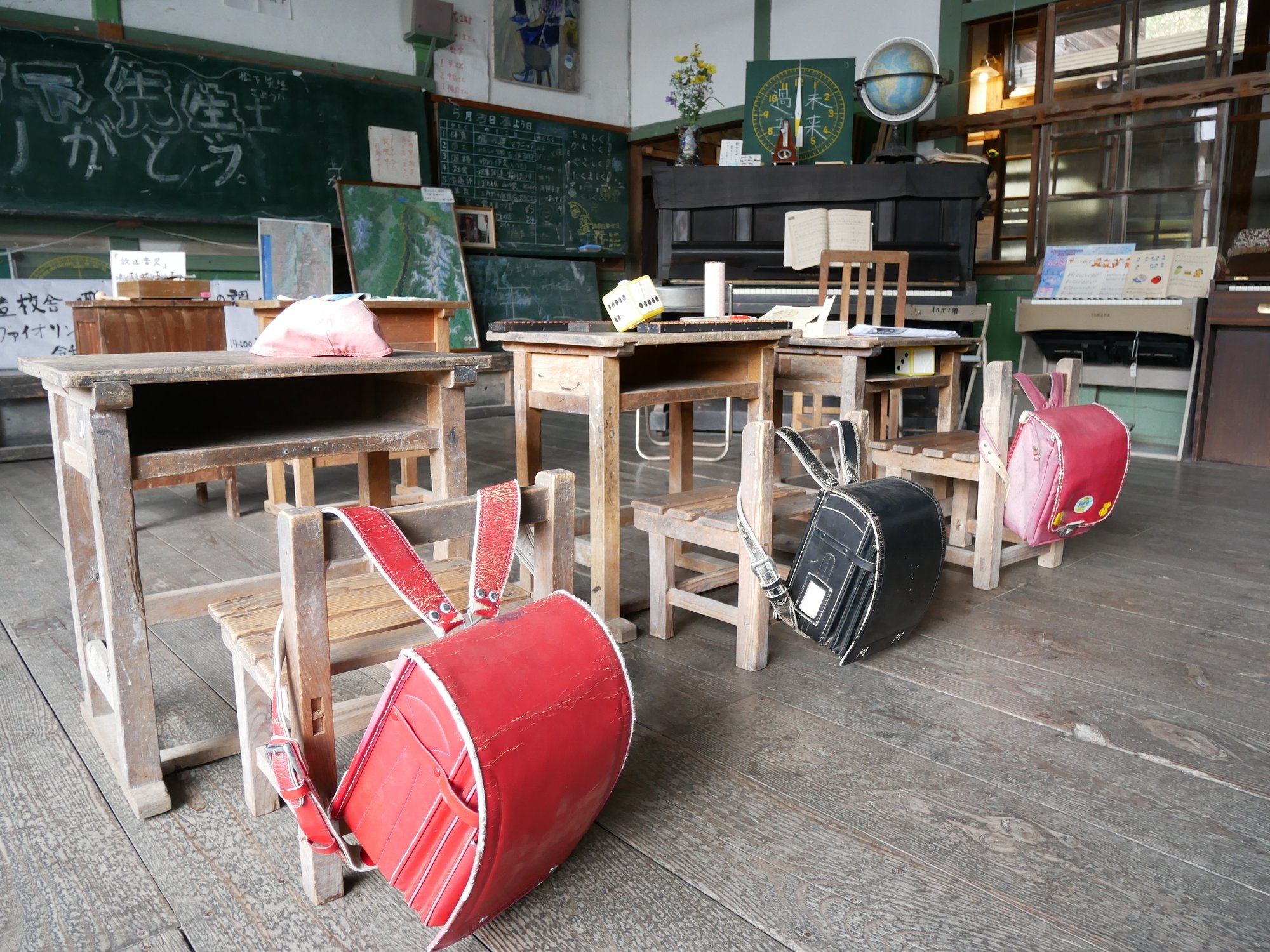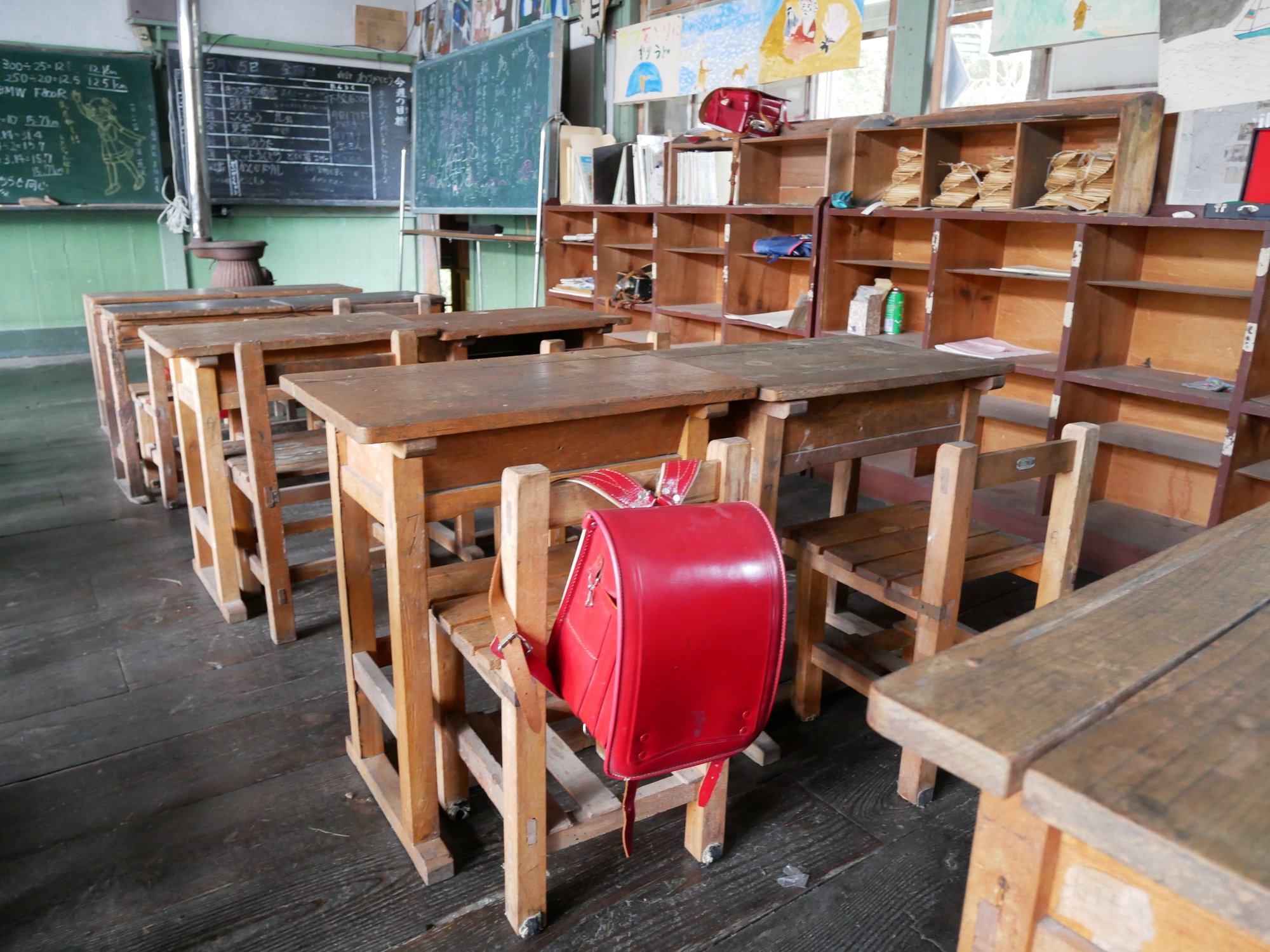 広い教室に3つの机。かつては森林鉄道の起点に近く多くの生徒がいたようですが、晩年はこのように生徒は少なかったものと想像できます。