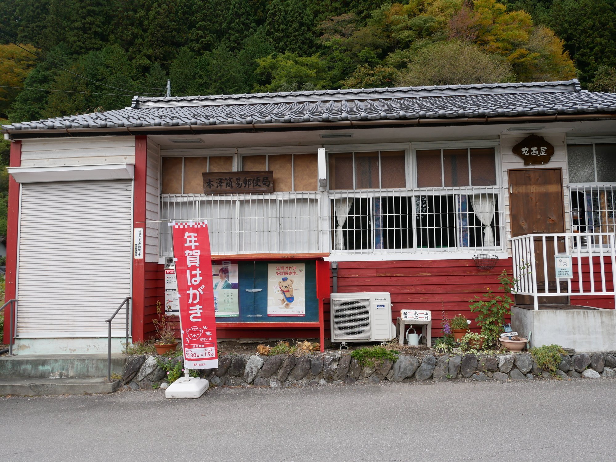 木沢地区はとても小さな集落ですが、簡易郵便局がありました。町中の郵便局とは違って民家を間借りしているかのよう。隣は丸西屋という蕎麦屋です。
