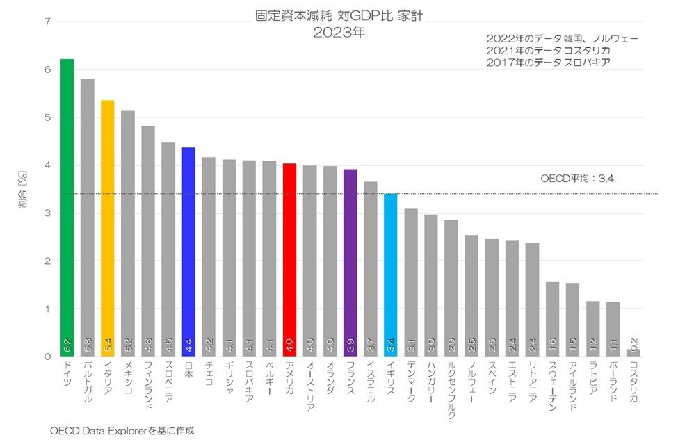 固定資本減耗は固定資産残高に影響を受けるはずですが、日本は相対的に残高が低い割に減耗が大きいという事になりそうです。